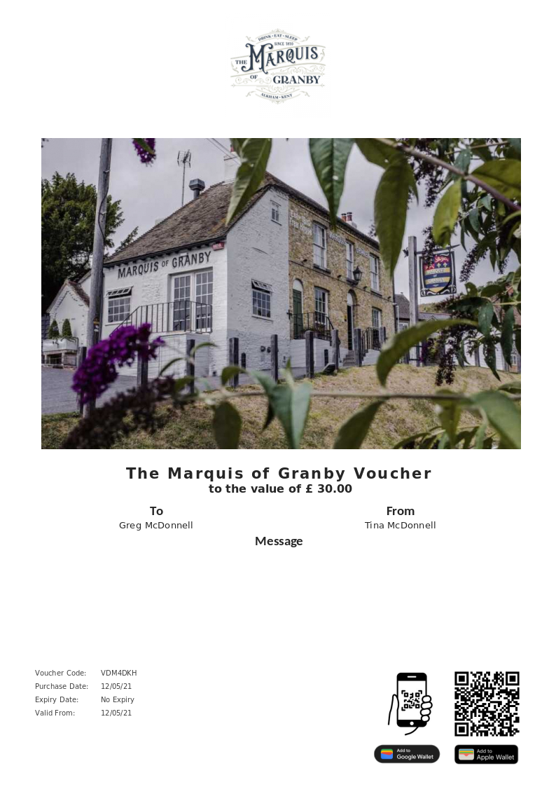 The Marquis of Granby allows you to purchase instantly printable gift vouchers, special offers and tickets using the Voucher Connect platform.